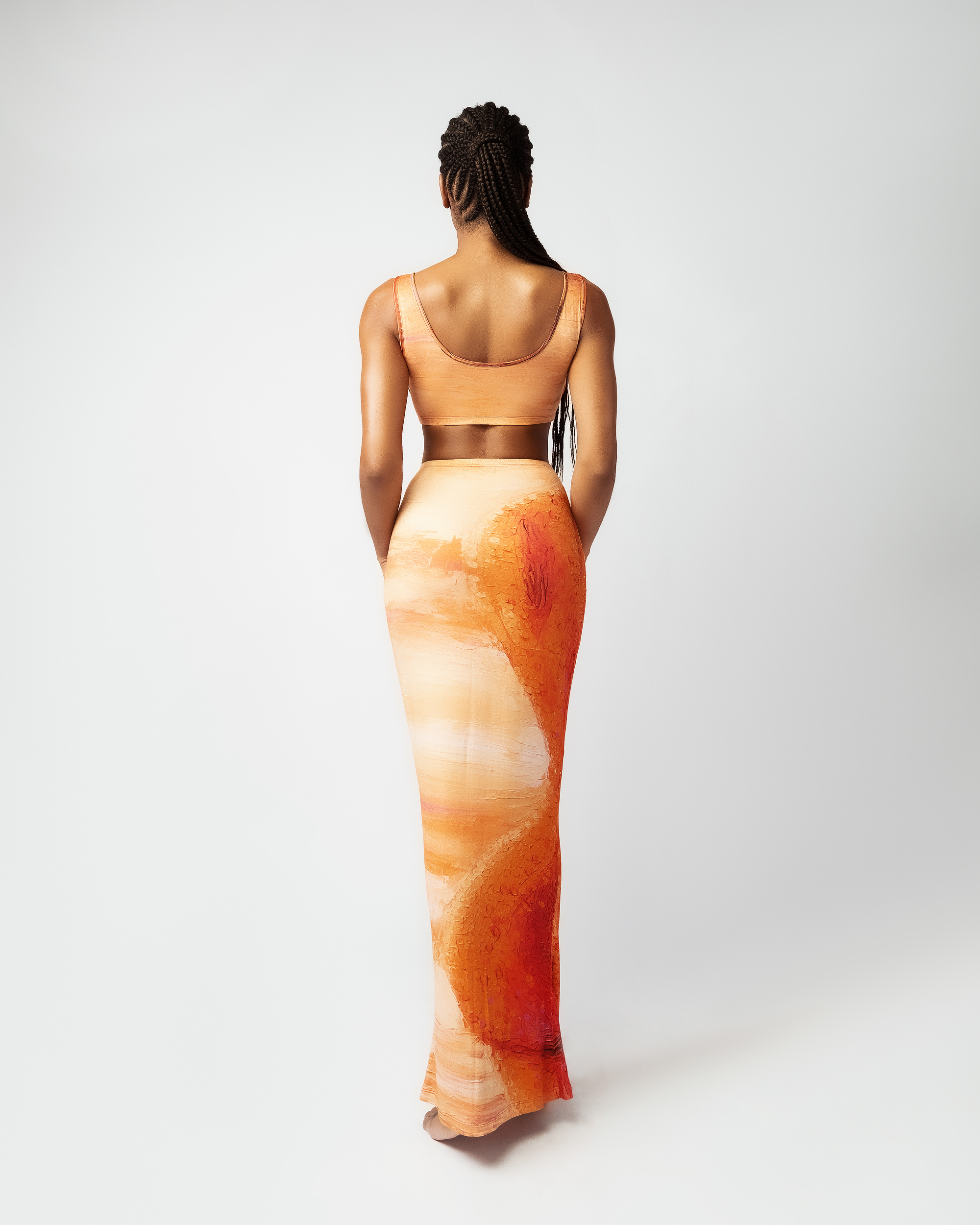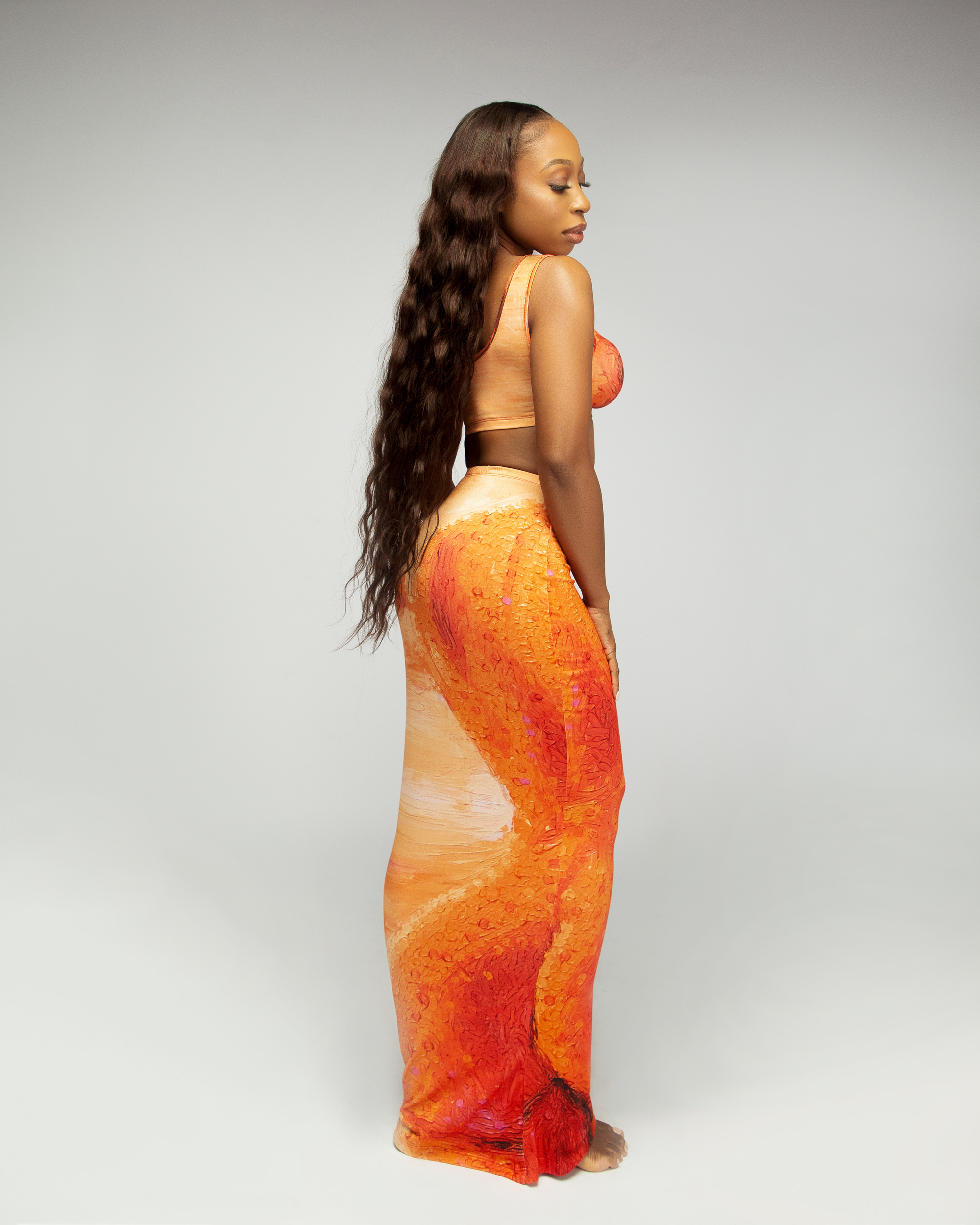 Heaven Sent© is our collaboration with talented artist JJ Kxng AKA Senicasso from Rivers State, Nigeria. It is a hand painted masterpiece created to represent the strength, unique beauty and purity of African female forms. The Heaven Sent© set made from the softest ECOVERO™ is effortlessly stylish and perfect for warm days and nights. The bra top is designed for a supportive close fit with thick straps and an elasticated under band. The maxi skirt is curve hugging yet flattering with a high-rise and elasticated waistband. Angel is wearing XS samples.